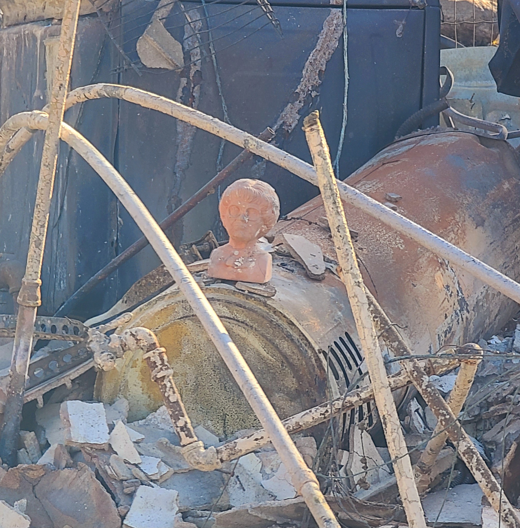 Two days later, I still didn’t know if I had lost my home, so I decided to make my way to Altadena to obtain some kind of certainty. Altadena looked like Berlin in the aftermath of World War II, with the Sheriff's Department and the National Guard on every corner. I managed to make my way to my street and saw the entire block had been wiped out. I got to the spot where my home had been, with the only recognizable marker being the chimney and a wrought iron bookshelf that now looked like a clock in a Salvador Dali painting. I scanned the minutiae looking for something salvageable, and as I moved around, I recognized the remnants of what used to be my water heater with something the color of a cooked salmon dinner sitting on top. It took me a minute to realize what it was, and I could only think, "You have got to be kidding me." In a perfect "don't do this at home, kids" moment, I stupidly waded across the rubble in a pair of well-worn Jack Purcell sneakers, mercifully managing to avoid every rusty nail in my path. At the end of this prospective tetanus-in-the-making journey, I looked down to see a terracotta Sophia Petrillo staring back. My familiarity with Estelle Getty's voice allowed me to hear Sophia Petrillo barking at me in a Brooklyn accent to "get her the hell out of there." The tears streaming down my face belied the fact that for the first time in two days, I laughed.