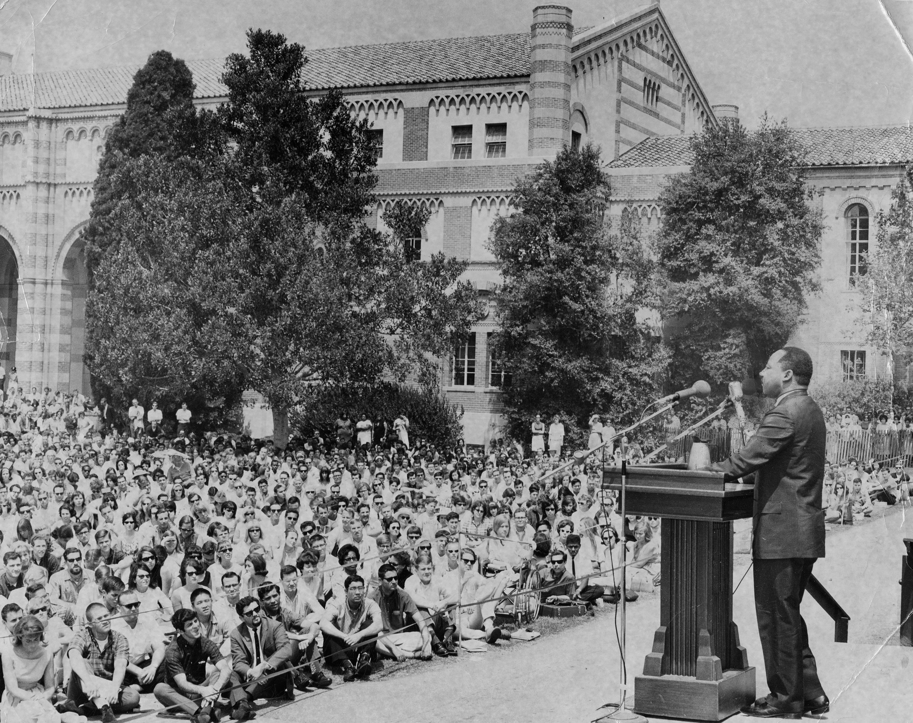 King speaks to a crowd of 4,500 on the campus of the University of California, Los Angeles on April 27, 1965. Here, he called for students to join a "Domestic Freedom Corps" to work in 120 counties of the Deep South to help increase the number of registered African American voters.
