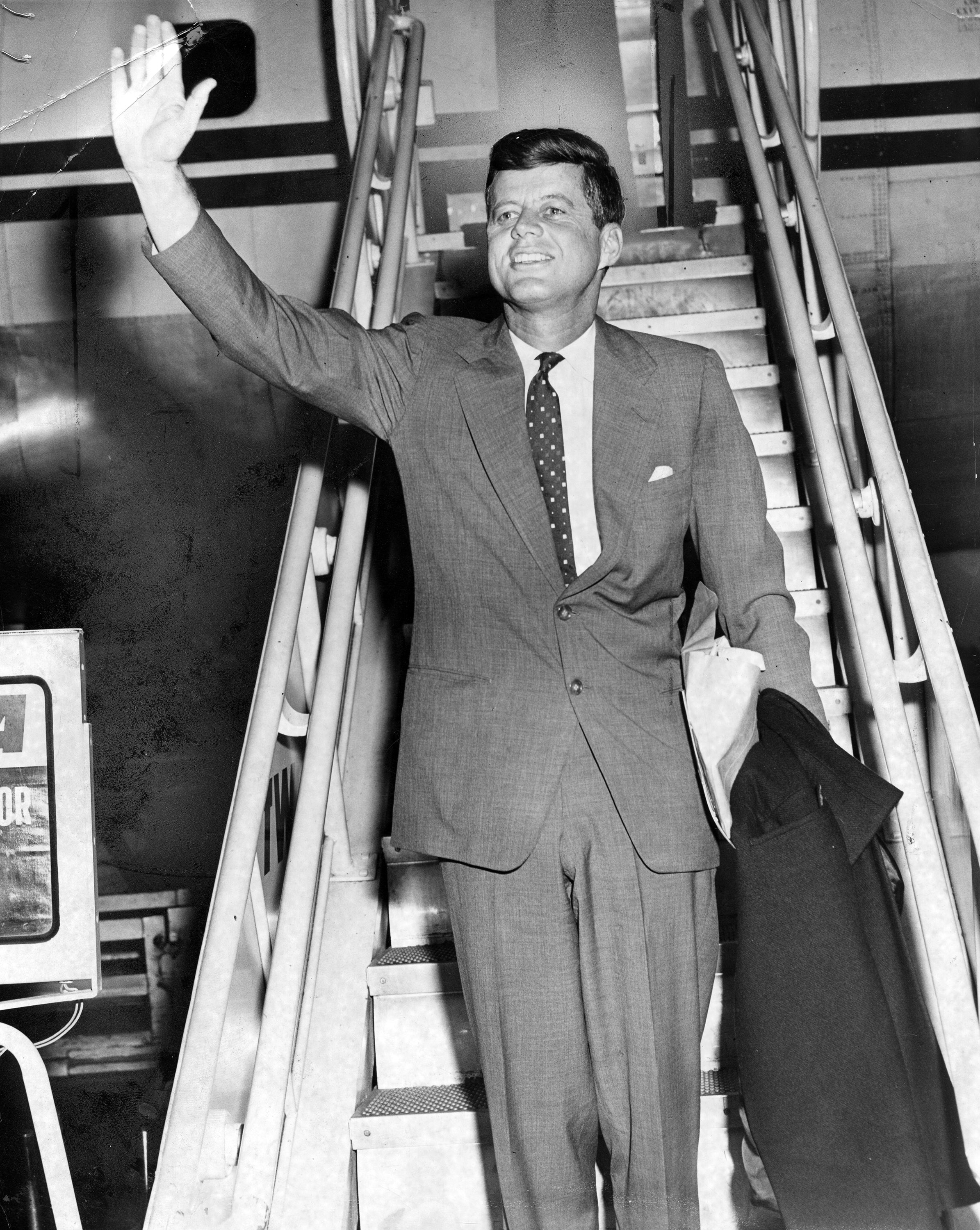 Senator John Kennedy emerges from a TWA airliner in Los Angeles where he is scheduled to speak at the Greater Los Angeles Press Club in 1959.