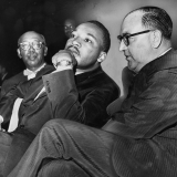 Martin Luther King and Governor Edmund G. Brown during a Freedom Rally at the Los Angeles Sports Arena on June 18, 1961. An audience of 12,000 was expected at the 18,000-seat venue. When over 25,000 people showed up to hear King speak, many remained outside and listened to the speech over loudspeakers.