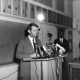 Attorney General Robert Kennedy fields questions during a press conference at Markham Junior High in 1964.