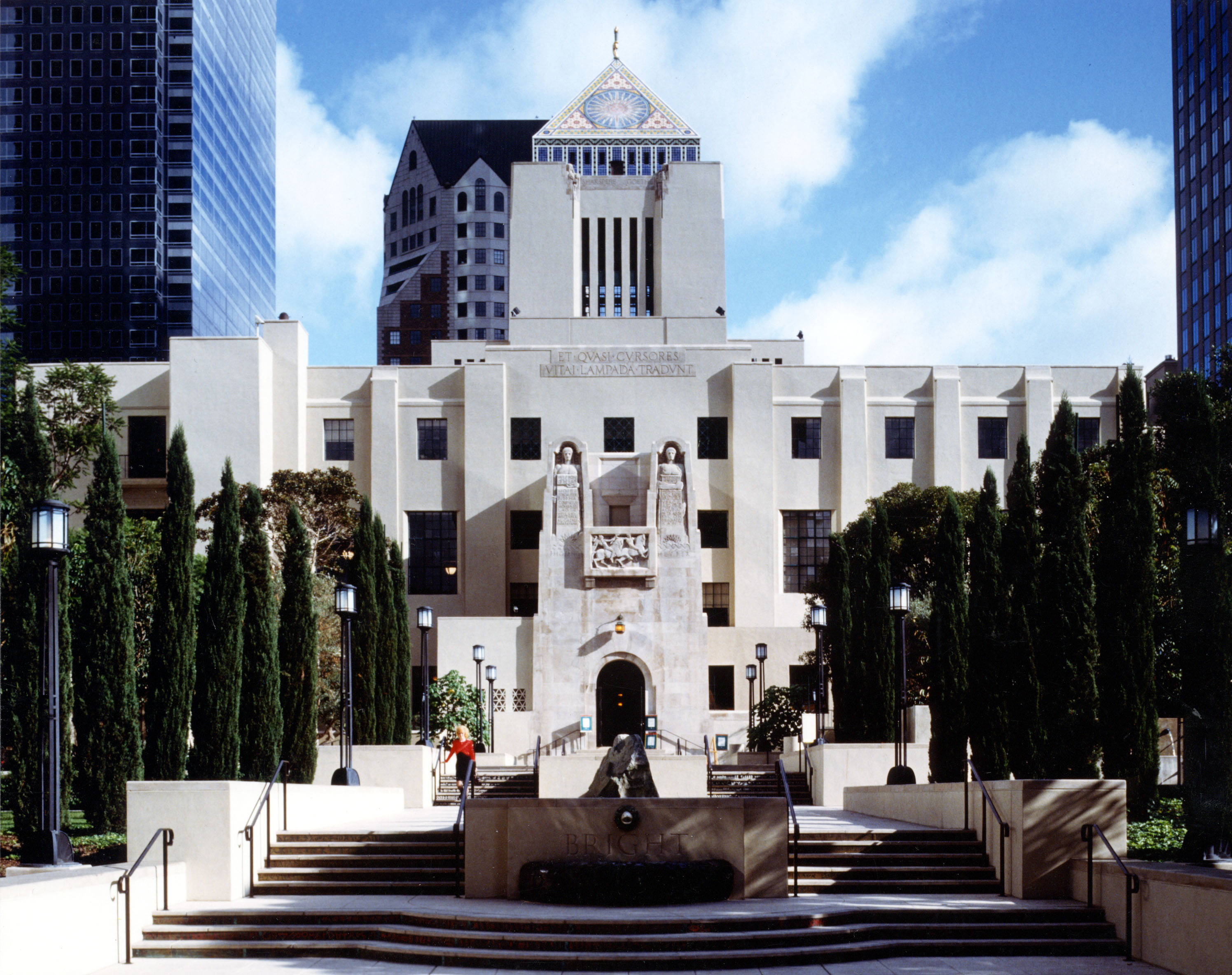 1st Row, L to R: Atrium, Exterior - Pools, Exterior - Flower Street Entrance, Children's Literature Dept.