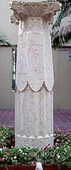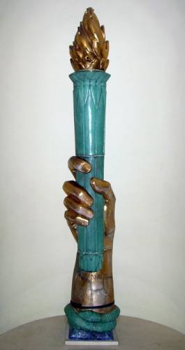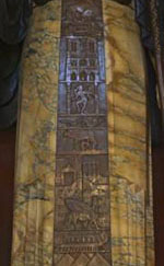 A copper panel superimposed on the sculpture represents the history of civilization in pictographic images running from bottom to top: the pyramids for Egypt, a ship of the Phoenicians, the Winged Bull of Babylonia and a tablet bearing the Ten Commandants, the Lion Gate of Mycenae and the Parthenon for the archaic and classical Greeks, Romulus and Remus for Rome, a dragon for China, the god Siva for India, Notre Dame for Medieval Europe, the Plumed Serpant Head for the pre-columbian Mayans, and a buffalo, covered wagon and the Liberty Bell for the United States.