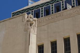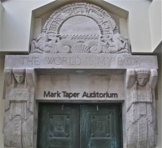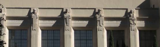 The Flower Street facade exemplifies the sophistication of Professor Alexander’s layered program of linked symbols. At the facade’s upper edge appears the last line of a passage in Latin from Lucretius Book 11:79: ET QUASI CURSORES VITAI LAMPADA TRADUNT which freely translated says, “Like runners they bear on the lamp of life.” Directly below a relief of horsemen passing a torch embodies the quote. The remainder of the facade carries out the theme of illumination. Two monumental sculptural figures, Phosphor and Hesper, personify the morning and evening stars. Beneath each figure’s feet, emblematic representations of sunrise (associated with Phosphor) and sunset (Hesper) suggest the cardinal points East and West. This abbreviated symbology in turn expands to suggest a whole history of knowledge engraved on scrolls listing great writers and thinkers divided between East (Asia and the Middle East) and West (classical cultures and Europe).