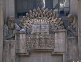 While the Goodhue Building’s concrete shapes look forward to the streamlined architecture of the 1930’s and 40’s, an aspect of its design harks back to the 19th century. The original Central Library was a “literate building”, meaning that it was decorated with an extensive program of symbolic sculpture and uplifting inscriptions. Goodhue’s library had in common with any number of buildings inspired by the City Beautiful ethos the aim of using art to inculcate the public, particularly new immigrants, with appropriate ideals and values. As one moves around the building’s exterior, the art and inscriptions celebrate the library’s function as both storehouse of knowledge and guardian of high culture.