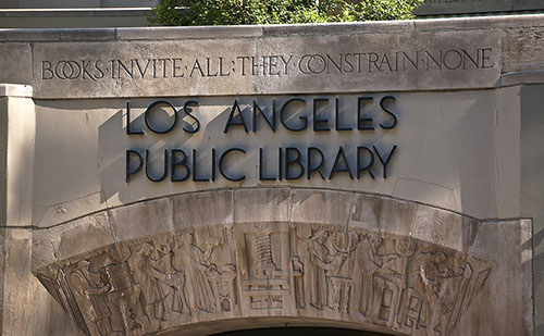 The 5th Street entrance (where Goodhue had originally hoped to place a pedestrian bridge) presents figures of the Philosopher symbolizing reason and the Poet, expression. They flank the city’s coat of arms. On the entablature above is a quote from the Philobiblion by 14th century poet, Richard de Bury translated freely from Latin to English: “Books alone are liberal and free/ They give to all who ask/ they emancipate all who serve them faithfully.”