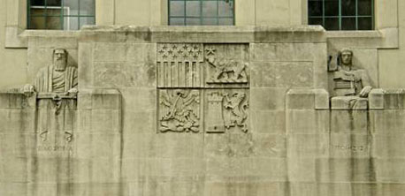 The system of meaning that organizes the exterior and to some extent interior art of the library was conceived by University of Nebraska philosophy professor Hartley Burr Alexander who first collaborated with Goodhue on the Nebraska state capitol building. Although Goodhue generally devised iconographic themes for his buildings, his initial plans for the capitol had been widely criticized for a lack of focus on Nebraska’s state history. At that point the architect realized he needed help and was persuaded to take on Nebraska native Alexander as an associate.