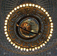 The Rotunda contains no sculpture--it is decorated with stencilled patterning and murals--but there is a large bronze chandelier modeled by Lee Lawrie that presents both symbols and decorative motifs relating to the Light of Learning theme. Nine feet in diameter, its outer edge is rimmed with 48 light bulbs signifying the (then) 48 states. Signs of the Zodiac are distributed around the inner rim, and in the center is suspended a glass globe painted with representations of the oceans and continents. The support chains are decorated with a crescent moon and stars and the whole is suspended from a painted sunburst that marks the center of the dome.