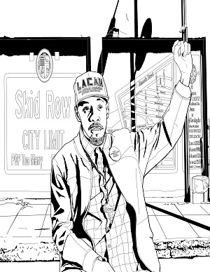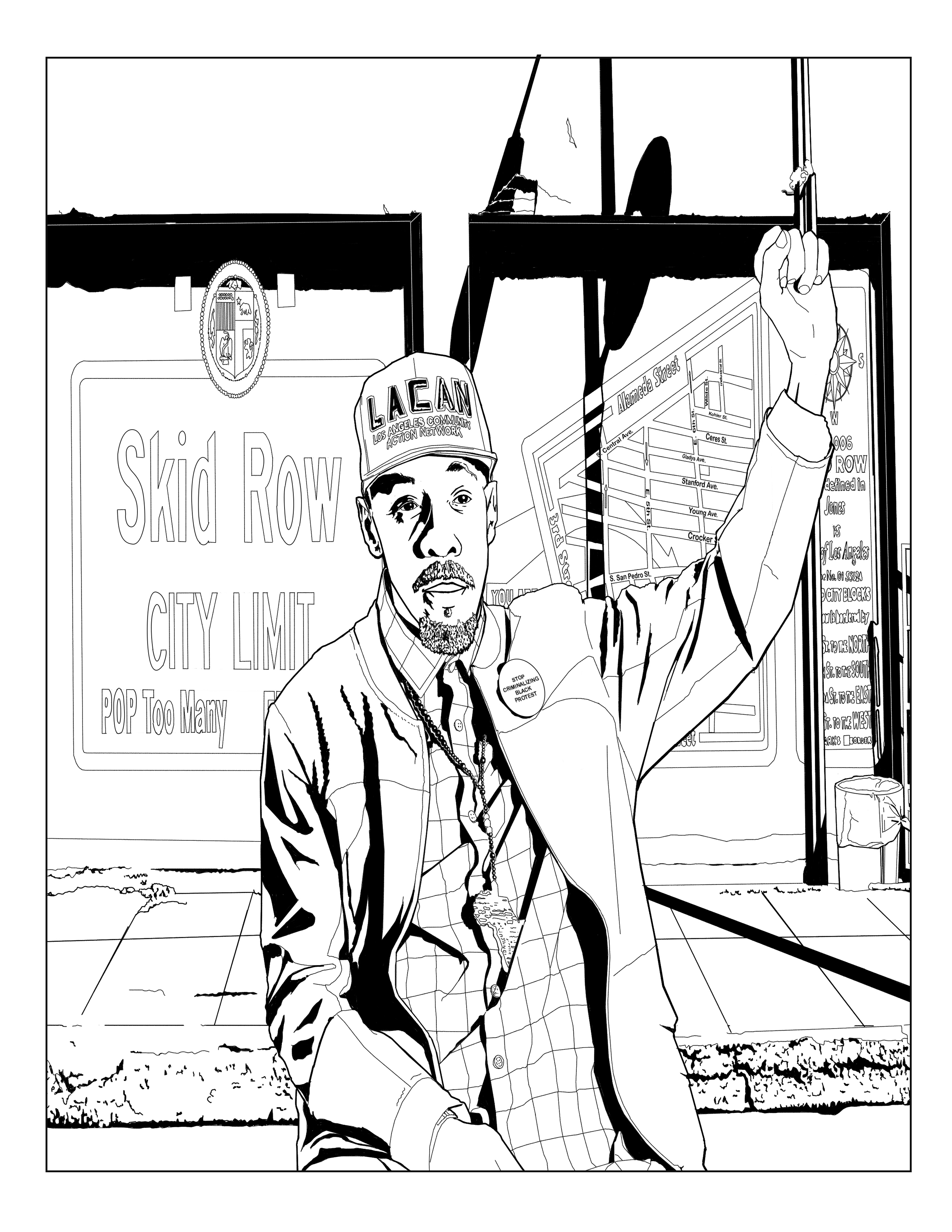 Skid Row City Limit Mural (also known as Skid Row Super Mural) is an 18-by-50-foot artwork showing a detailed street map of skid row and an official-looking sign proclaiming the neighborhood’s “city limit” and population (“too many”). Skid Row activist Jeff Page created the project as a community-organized activity. Stephen Ziegler designed the mural; a group of street artists called the Winston Death Squad painted it. The geographic limits of skid row shown on the map were taken from Jones vs. the City of Los Angeles, a court case that barred nighttime homeless sweeps by police.