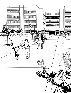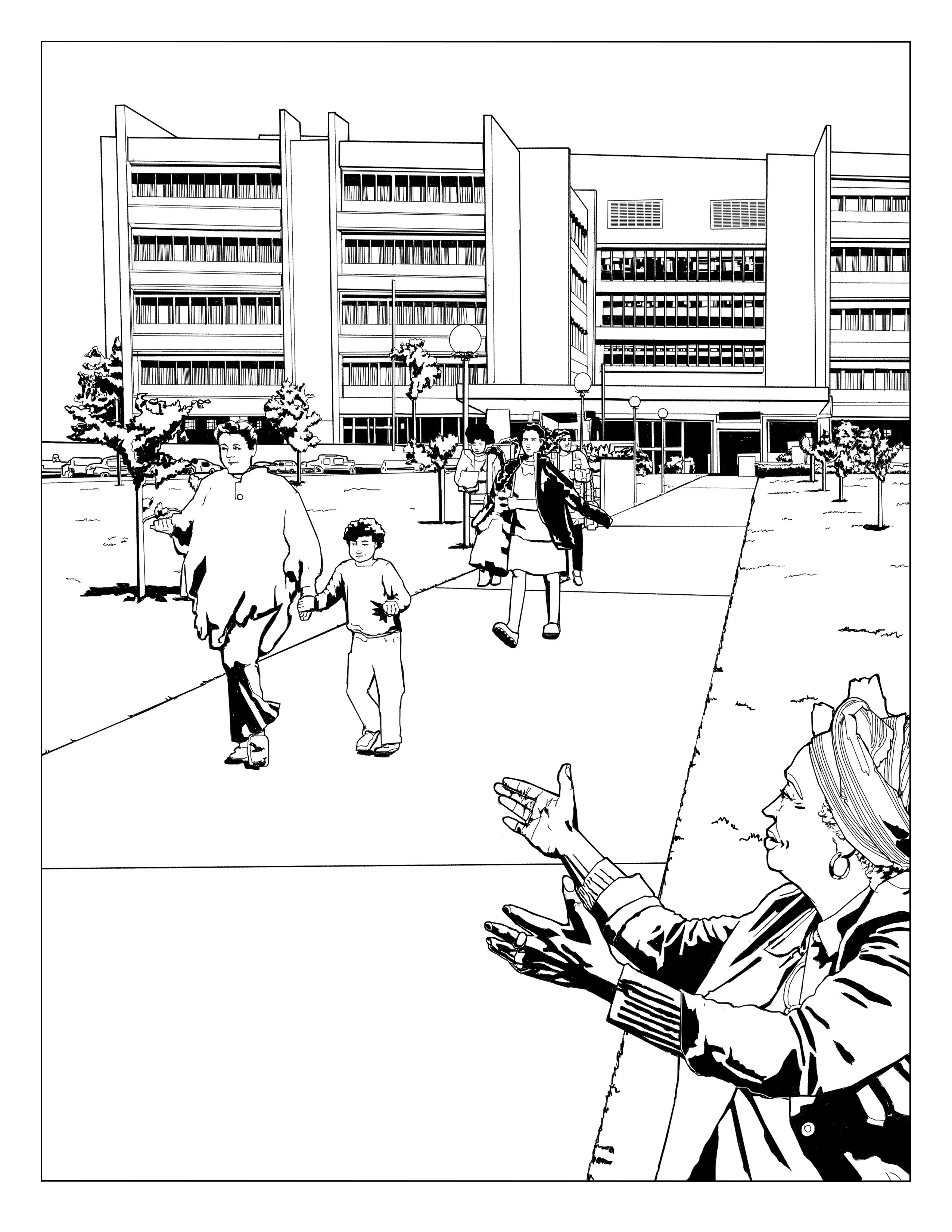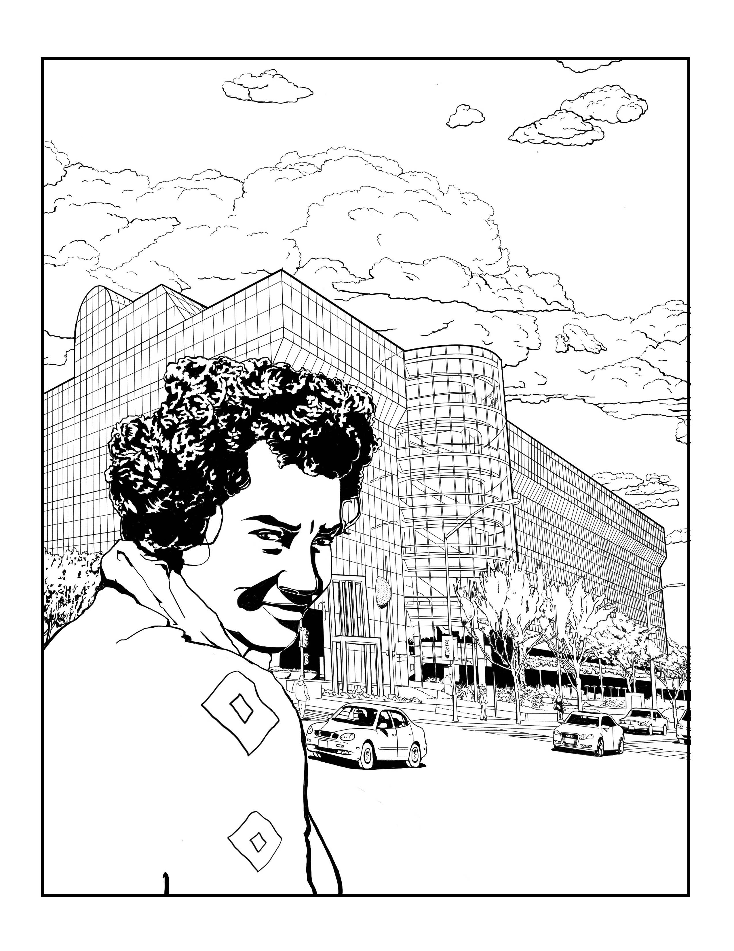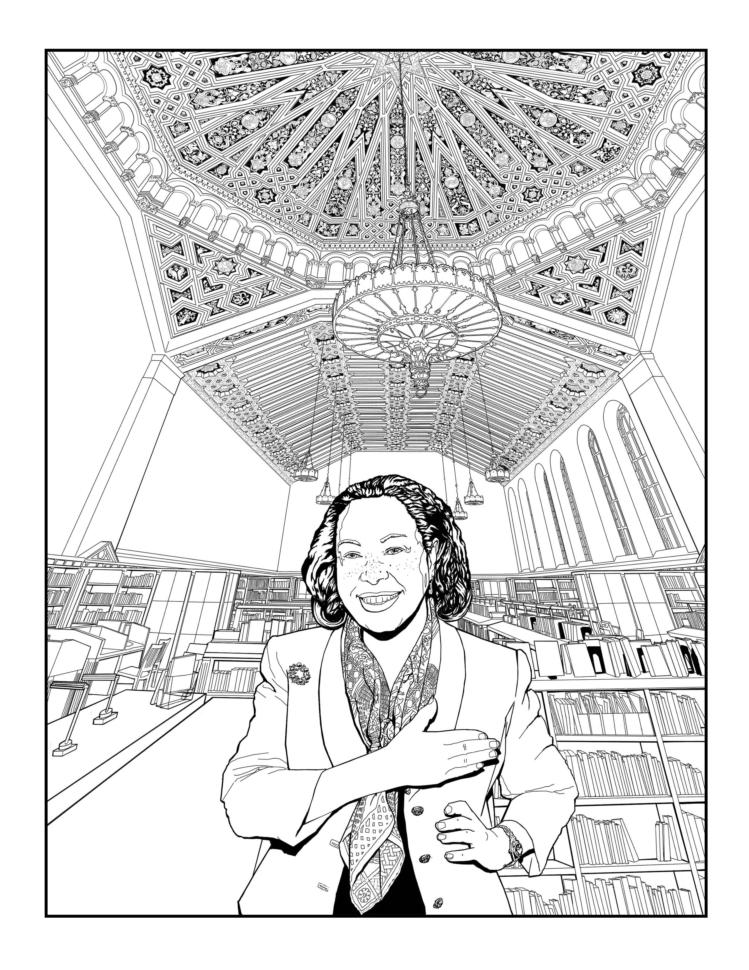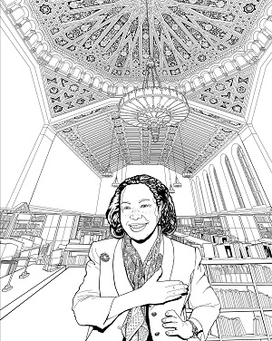 This coloring page shows Patricia Bath inside Powell Library, one of the four original buildings on the present-day campus of the University of California, Los Angeles. UCLA was established in 1881 as a teachers college in downtown Los Angeles; it moved five times before relocating in 1929 to its current site, in the Westwood neighborhood of L.A. Author Ray Bradbury tapped out an early draft of his sci-fi classic Fahrenheit 451 on rented typewriters in this building. The ceiling shown here is the work of artist Julian Ellsworth Garnsey, who also designed and painted the magnificent ceiling of the rotunda in the Los Angeles Central Library, as well as other ceilings and murals throughout that building.