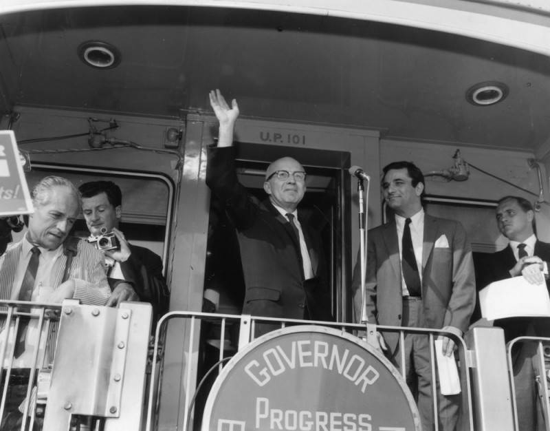 Augustus Hawkins was the second African American elected to the California Assembly, the first African American to serve California in Congress, and the first black politician west of the Mississippi River elected to the House of Representatives. Hawkins was fair skinned, often being mistaken for white and given preferential treatment on buses while growing up. He chose to walk instead. He was a champion of equal employment opportunities, fair housing and civil rights. Here, he waves to supporters from Governor Edmund G. Brown's campaign train in 1966. Actors Peter Falk and Bob Newhart are seen on the right. (Rolland Curtis Collection/Los Angeles Public Library)