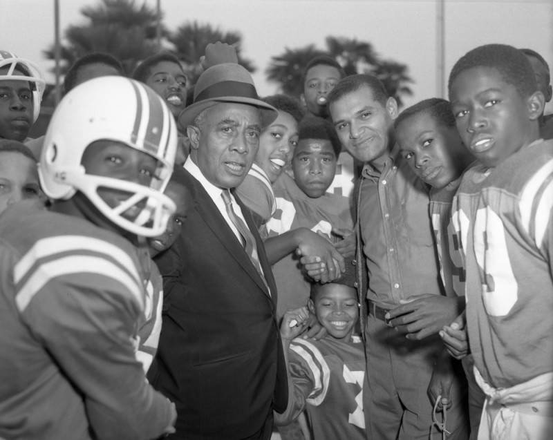 Gilbert Lindsay was born on a cotton plantation in Mississippi where he later picked cotton for 50 cents a day. In 1928, he moved to Los Angeles and became a janitor for the Department of Water & Power. By 1963, at the age of 62, Lindsay became the first African American to join the City Council. Appointed to fill a vacancy, he was reelected consistently until his death in 1990. Here, Lindsay (left) and Billy Mills pose with young football players at Wrigley Field, circa 1966. (Rolland Curtis Collection/Los Angeles Public Library)