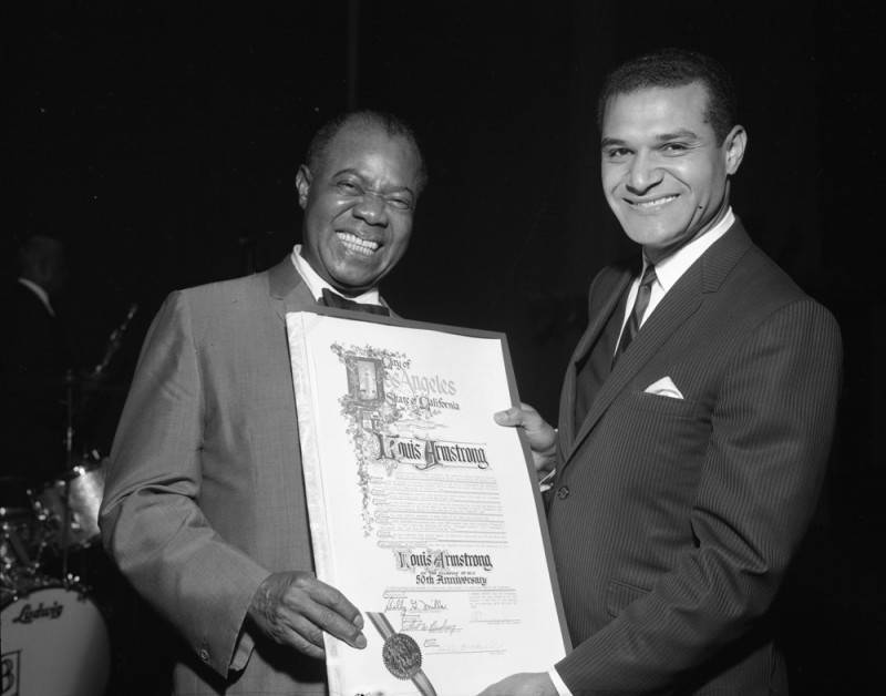 Elected in 1963, Billy G. Mills (1929-) was the third African American to serve on the Los Angeles City Council, a seat he held until 1974 when he became a Los Angeles Superior Court judge. He was the first African American chairman of the Democratic County Central Committee, winning over fellow Councilman Tom Bradley by just three votes. Here, Mills (right) presents a resolution to musician Louis Armstrong in 1966. (Rolland Curtis Collection/Los Angeles Public Library)