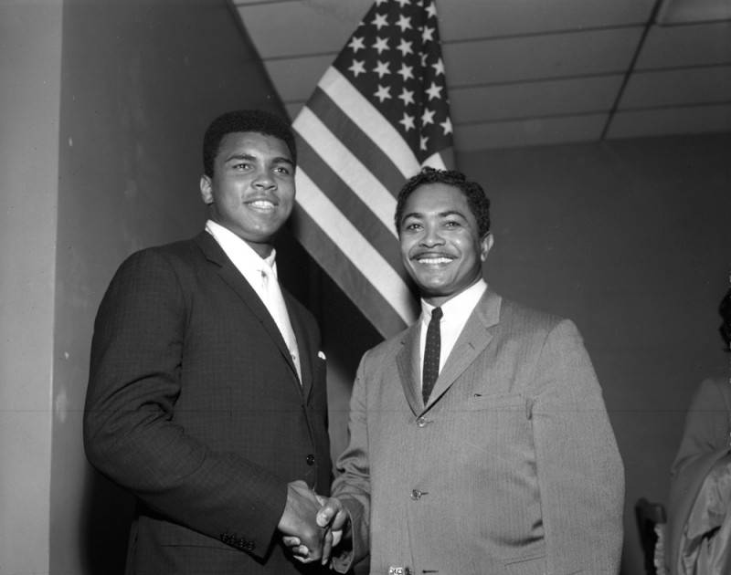 Born in Trinidad, Mervyn Dymally moved to the United States at the age of 19 and became a citizen in 1957. In 1962, he became the first foreign-born black lawmaker elected to the Assembly. In 1966, he was the first African American elected to the state Senate, and California's first African American Lieutenant Governor in 1974. Dymally had amazing staying power. In 2002, he found himself dissatisfied with the candidates for his original Assembly seat and chose to run again, winning back the seat he'd left, at the age of 76. Here, Mervyn Dymally (right) is shown with Muhammad Ali at a Compton NAACP meeting 1966. (Rolland Curtis Collection/Los Angeles Public Library)