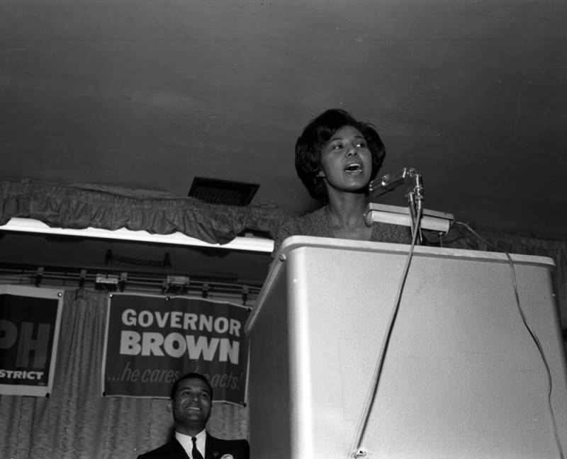 In 1966, Yvonne Brathwaite Burke became the first African American woman elected to the California Assembly, and in 1972, was the first woman elected to the House. She was also the first woman to chair the Congressional Black Caucus. In 1972, she became the first Congresswoman to give birth and be granted maternity leave while serving Congress. Here, she is shown speaking at a rally for gubernatorial incumbent Pat Brown, circa 1966 as Councilman Billy G. Mills looks on. (Rolland Curtis Collection/Los Angeles Public Library)