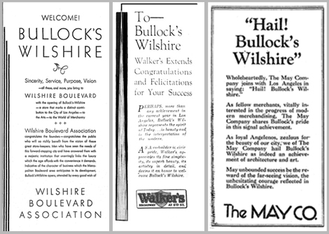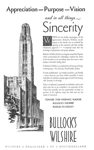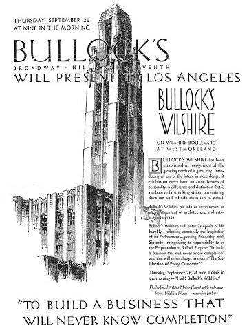 It cannot be overstated that the Bullocks Wilshire building was an integral component in L.A’s growth in terms of both civic and commercial development. Only two days after the opening, the Times continued to gush about the store and what it symbolized for the city’s future: “the magnificent new merchandise emporium he [John G. Bullock] has just opened to the public on Wilshire Blvd is another striking demonstration of how and why Los Angeles continues to grow. Not so many years ago the site of Bullock’s new store was a subdivision on the outside fringe of suburban Los Angeles. Faith in our business pioneers drove the great artery of Wilshire Boulevard from Westlake Park to the oceanfront at Santa Monica...So long as our leading businessmen are thus ready to stake their faith and their capital on the continued growth of Los Angeles we need never waver in our confidence that Southern California is destined to fill a leading place in the new era of world development.” Indeed, despite the stock market crash nearly one month later, the success of Bullocks Wilshire would encourage business growth along the Wilshire Blvd corridor beyond the Downtown area moving towards Santa Monica.