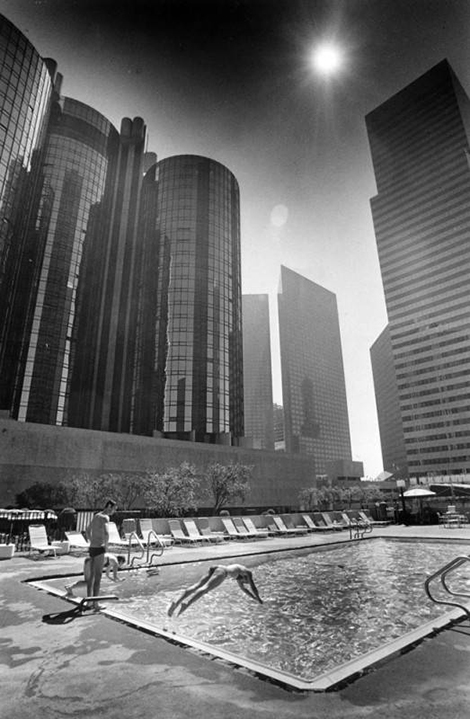 Thanks to industrial pollutants, the sun is often visible in the daytime. “Visitors from France and Italy seek refuge form the heat and smog in the Hotel Bonaventure’s pool,” [1984]. Photo credit: Leo Jarzomb, Herald Examiner Collection