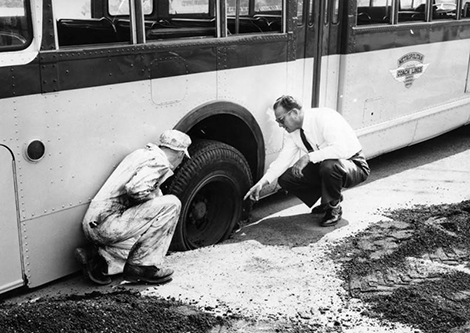 Road collapses in heat: Valley heat proves too much for road patch at Sherman Way and Havenhurst. Blacktop gave way, dropping rear wheel of bus into three-foot hole,” [1956]. Valley Times Collection