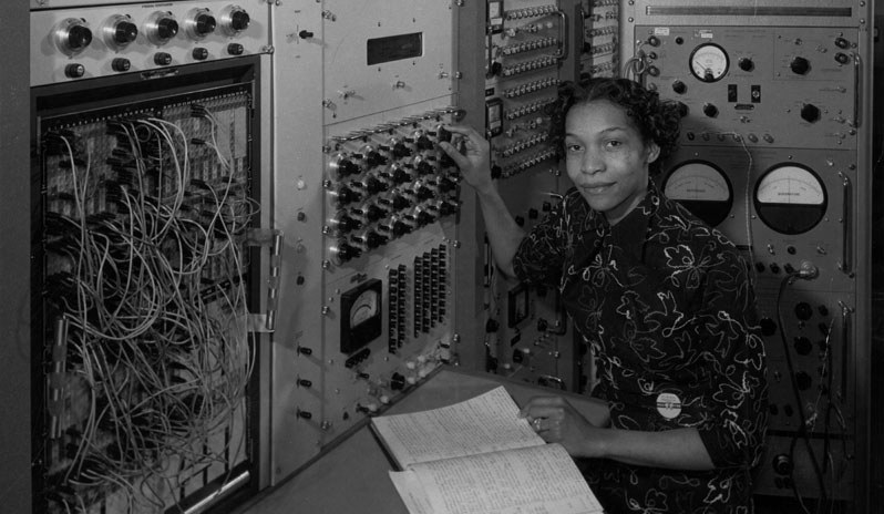 Photograph caption dated February 4, 1959 reads, "Deals In Powerful Ideals - Nasira Wilkins of Los Angeles is graduate of Howard University with master's degree in physics. She spends her Rocketdyne hours studying new liquid propellant rocket engine concepts."