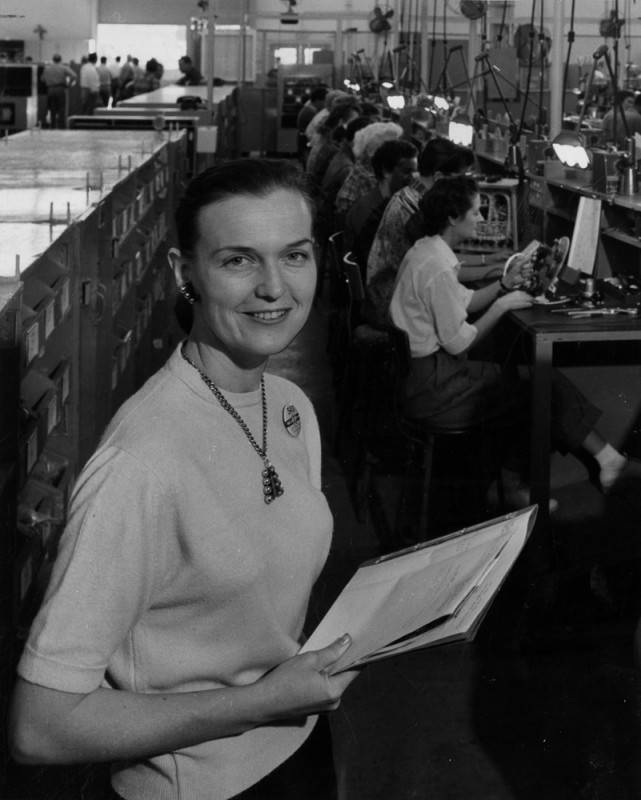 Photograph caption dated February 4, 1959 reads, "Lead Woman Insures Live Wires - Thelma Batchlor of Woodland Hills, 10-year veteran with North American Aviation, is lead woman in Rocketdyne electrical group supervising in wiring of junction boxes used in rocket engines that power nation's biggest ballistic missiles. There are 2,260 women at Valley plant who are backing space effort."