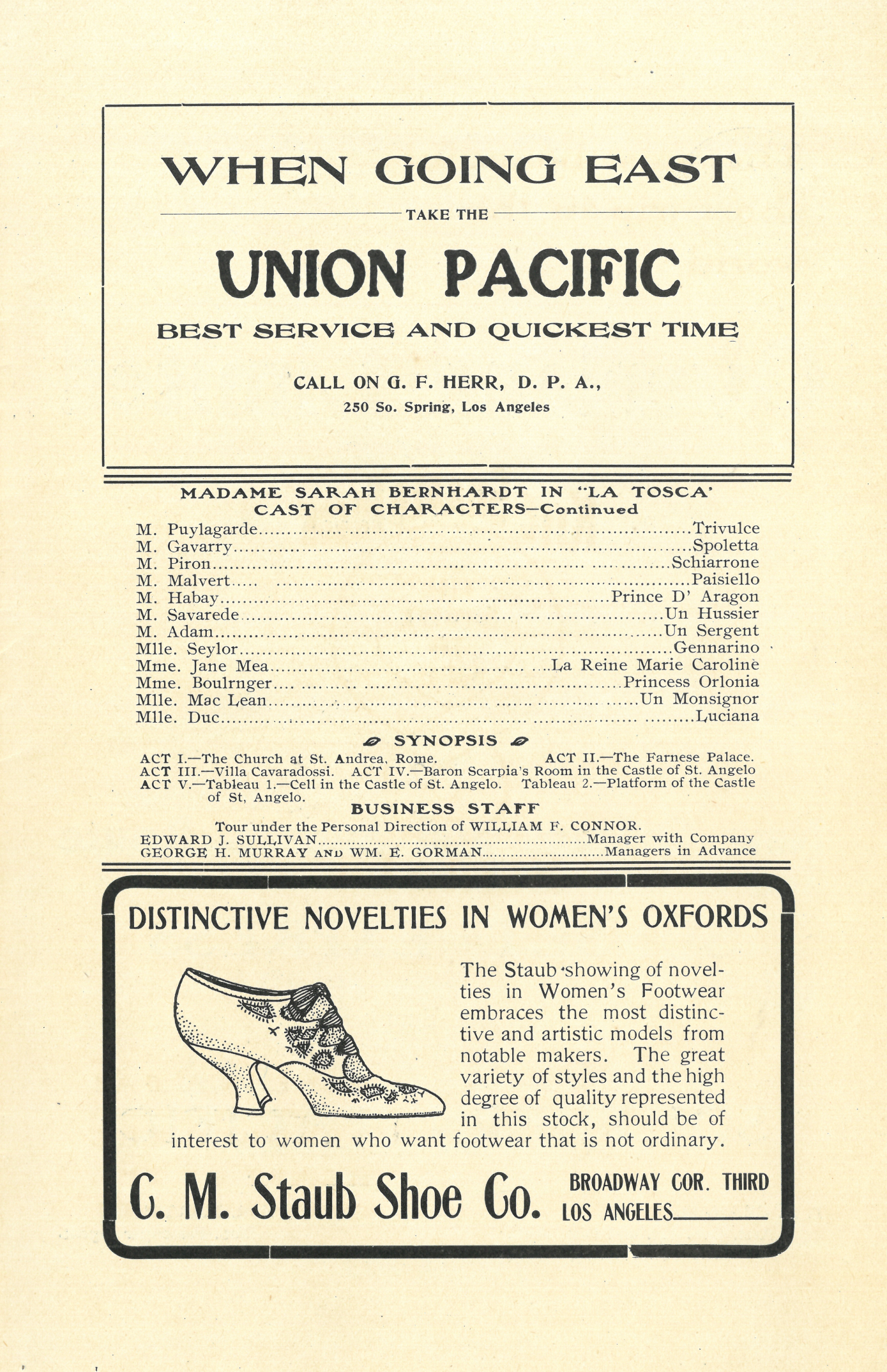 Bernhardt remained steadfast in her preference to perform in French. Unlike La Tosca, an English language version of the play had never been performed in Los Angeles and, with the death of her frenemy and rival Fanny Davenport in 1898, it was unlikely that a translation would happen anytime soon. This left many Angelenos to wonder if they would be able to follow the plot. Two days before the play premiered in Los Angeles, the Herald ran a synopsis of all five acts with the headline, "La Sorciere is a Masterpiece. Sardou says is his greatest." A nearly identical synopsis ran in the Times with markedly less fanfare, while booklets featuring translations of the plays with the disclaimer that these translations were authorized by Bernhardt as "the only correct version of my plays translated and printed from my own prompt books" were sold for 35 cents in the weeks leading up to the performance.