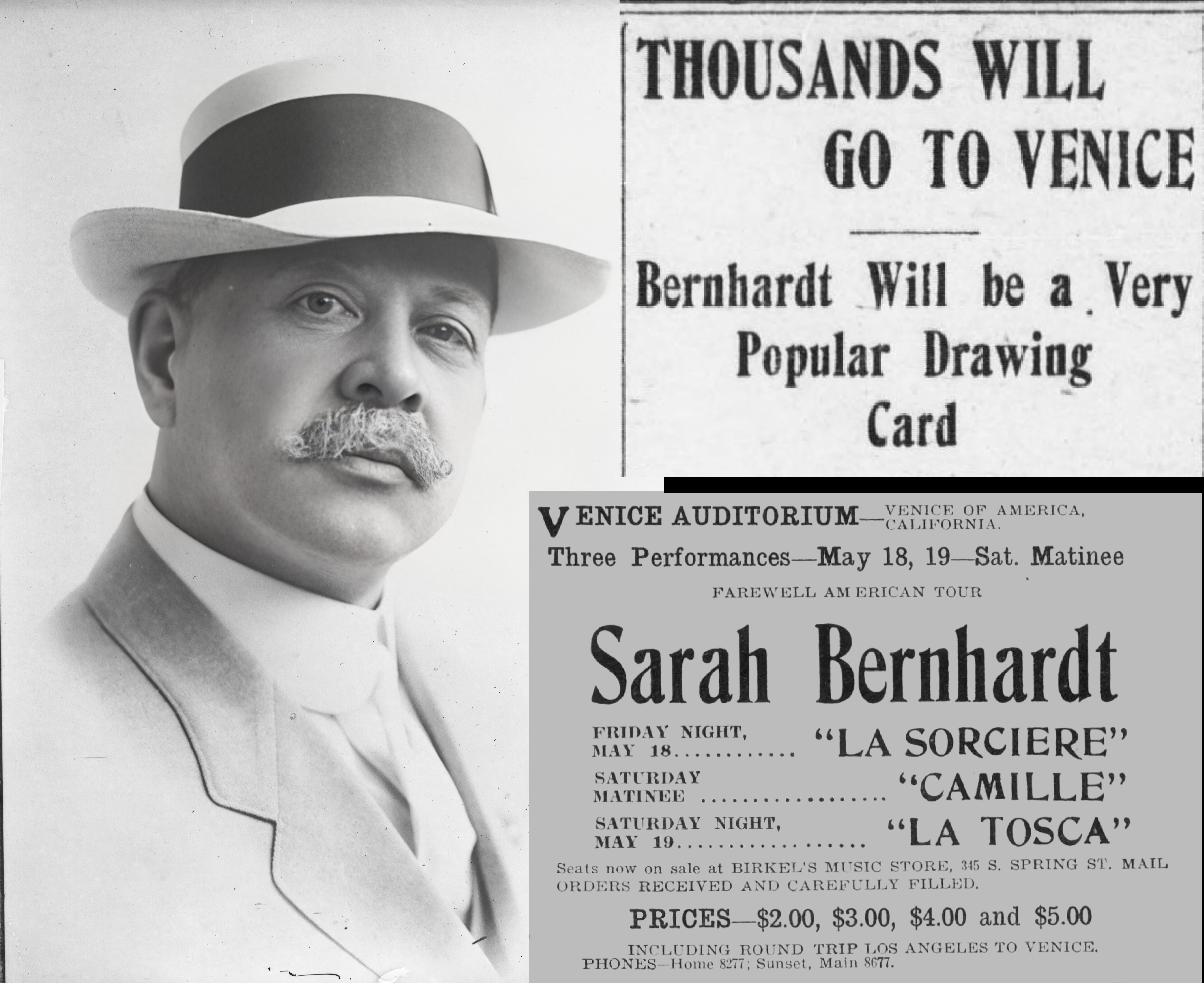 By early 1906, Abbot Kinney, like the rest of the United States, would have been aware of Bernhardt's "circus tent tour" as the circumstances were detailed in every major media outlet in the United States. As a morally and socially conscientious man, Kinney would have admired Bernhardt's grace under fire, her level-headed approach to the situation, and her selflessness in helping San Francisco's recovery. As a businessman, he would have also noticed that audiences would, quite literally, go anywhere to see her perform. Bernhardt was guaranteed to draw a crowd and, as this was advertised as her last tour, the urgency to witness these 'last' performances was at a fever pitch. A Bernhardt appearance would also have the added benefit of luring every important Angeleno out to Venice—even those who were hesitant to travel sixteen miles to a kitschy-themed resort community. Ralph Waldo Emerson said, build a better mousetrap, and the world will beat a path to your door; Sarah Bernhardt was Abbot Kinney's better mousetrap.