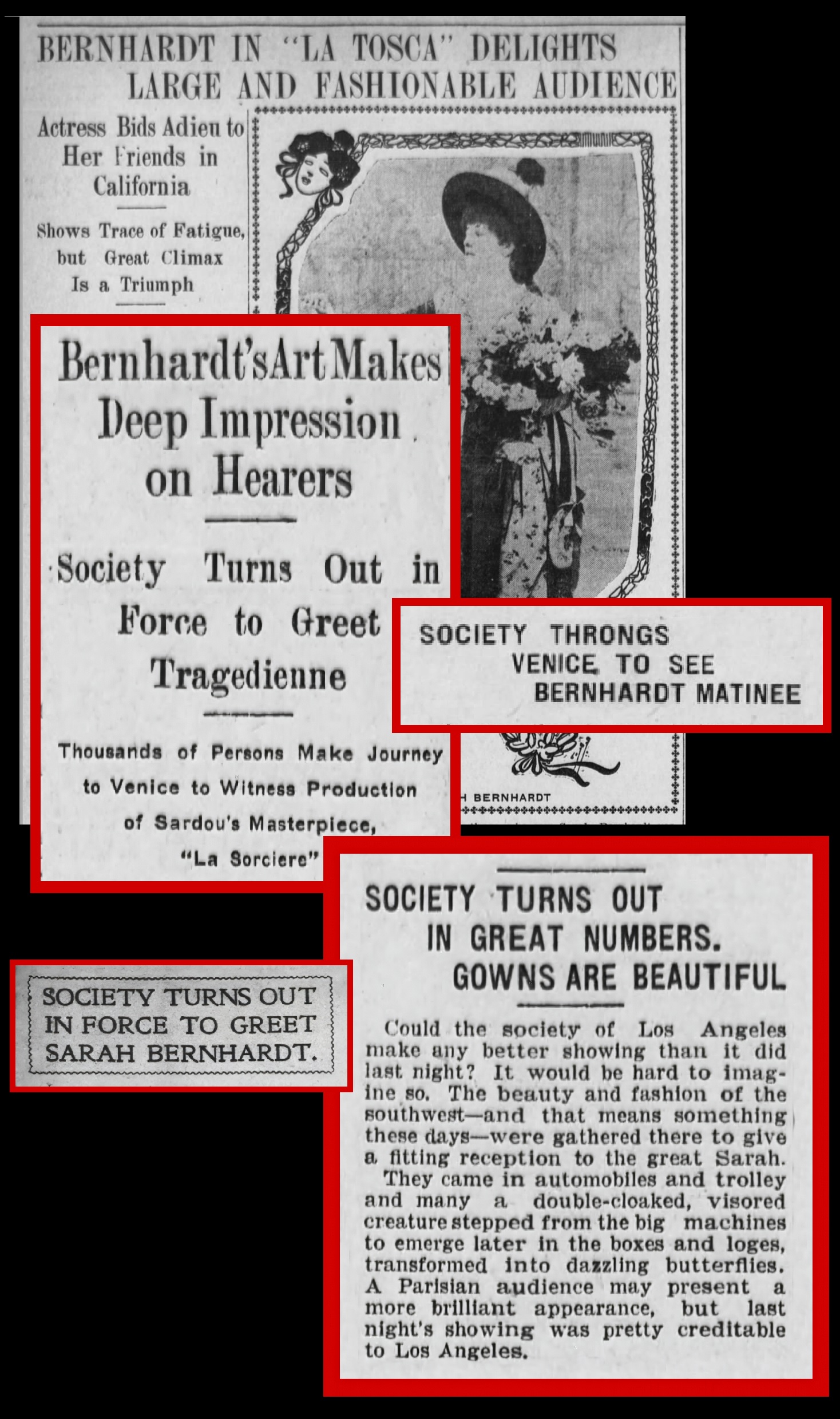 The Los Angeles Examiner noticed that Bernhardt’s appearance has "afforded a holiday for hundreds, reaching into the thousands of persons, who, in preference to going late to the performances have donned outing attire, made their way early to Venice, eaten at the Cabrillo, St. Mark’s and the Winward Hotels and have gone leisurely to witness the art of the great actress."