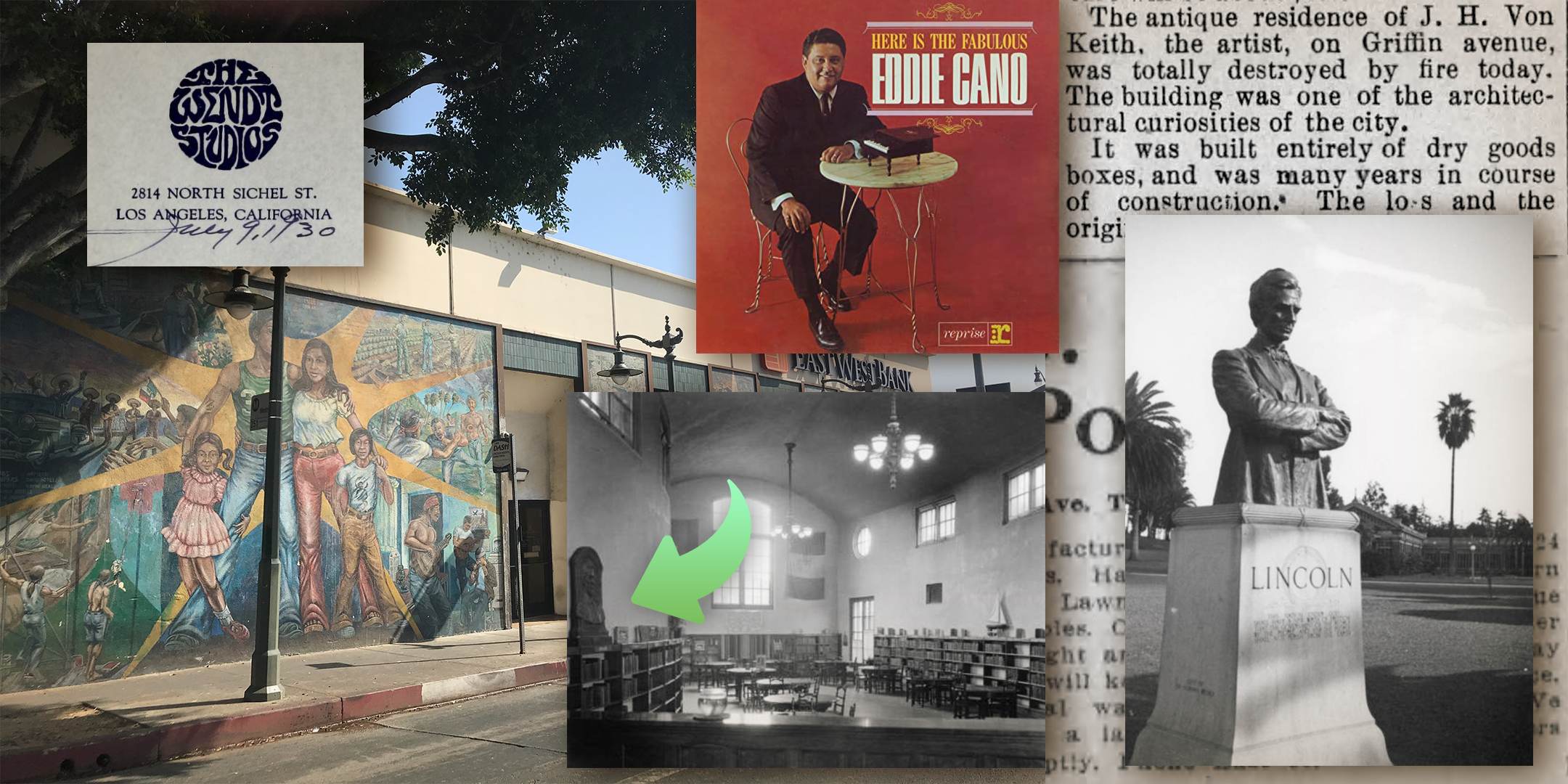 Beautiful murals can be found throughout the community art and artists have a long history in East Los Angeles/Lincoln Heights. One home near the library featured prominently in the Los Angeles art world. Artists Elmer and Marion Wachtel built a studio and living space at 2814 Sichel Street. While living there, from 1904 to 1906, newspapers reported that their studio was opened to the public for visits. After the Wachtels moved to Arroyo Seco in 1906, the studio/home was sold to another artistic couple, William Wendt and Julia Bracken Wendt. Mr. Wendt was one of Southern California's most prolific landscape painters in the early 20th century and a co-founder of the California Art Club. His wife, Julia Bracken Wendt, was a renowned sculptor. Both were firm supporters of the Lincoln Heights Branch Library when it opened in 1916. Mr. Wendt displayed his art at the library's opening, and Julia Bracken Wendt presented the library with a bas-relief of Abraham Lincoln in June 1922. [Another artist and author, John H. Von Keith lived briefly off of Griffin Avenue in a fanciful house made of "dry goods boxes" that, according to newspaper reports, burned down in 1890. East Von Keithian Avenue is his namesake.] Throughout the early 20th century, numerous pottery firms, including Bauer and Pacific, were also headquartered in Lincoln Heights.