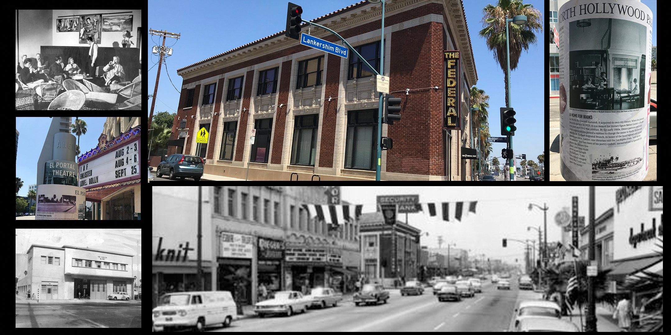 The library has books, newspaper articles, Chamber of Commerce publications, maps, and photos devoted to the history of the San Fernando Valley and North Hollywood's place within that history. These resources can help you learn about the community that started as Toluca, became Lankershim, and, in 1927, settled on the name North Hollywood. A few aspects of North Hollywood's history include agricultural growth, the arrival of transportation and water, and pioneers whose namesake streets we drive on today (e.g., Lankershim, Weddington, Van Nuys, Whitsett, and more). This tour even has a theme song!