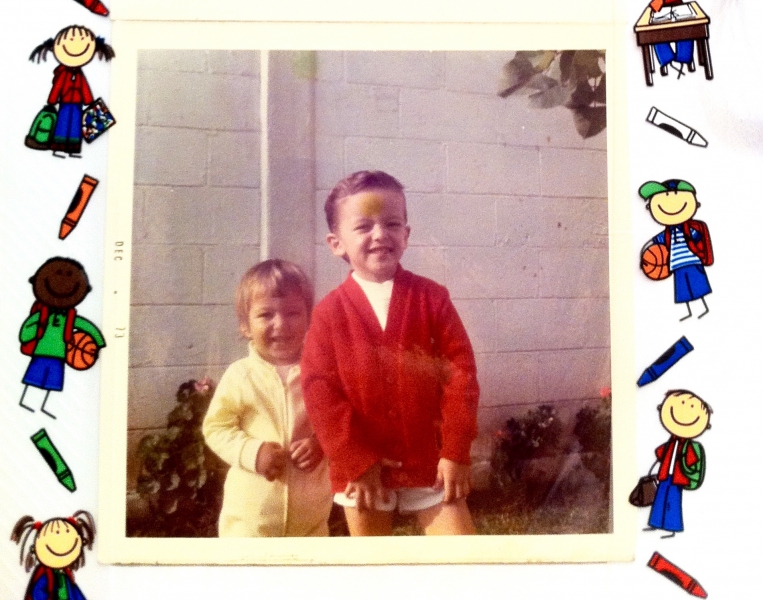 El autor, de rojo, en su primer día de clases. El de piyama es su hermano menor.