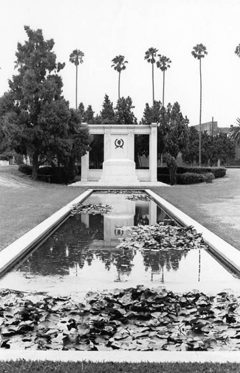 Forest Lawn Memorial Park has several locations throughout Southern California. Forest Lawn in the Hollywood Hills boasts a beautiful mosaic depicting events from the history of the United States. Here we see a Veteran’s Day event (which included a sacred torch rite performed by the American Legion) being held shortly after completion of the mosaic.