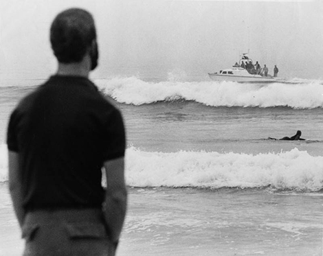 The Pacific Ocean is the final resting place of one who loved the water and endeavored to keep all beachgoers safe. A boat scatters the ashes of a lifeguard in the waters off of Santa Monica beach while surfers look on.