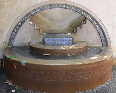 Fine provided the text for the Grotto Fountain that includes references to the 14th Amendment that freed the slaves, the irrevocable designation of citizenship, and the value and purpose of freedom of speech.