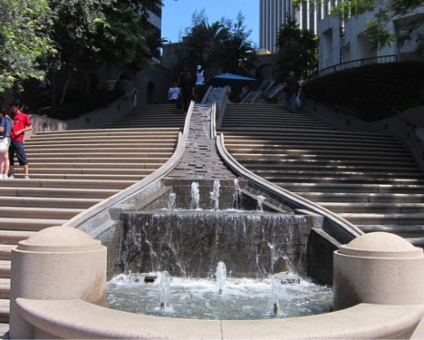 Although not on the library property itself, this dramatic fountain represents another elegant Lawrence Halprin design incorporating fountains cascading over rocks offset by stairs built over the Bunker Hill Steps. Located on Fifth Street, opposite the front entrance of the library, this was one of several proposed overpasses for Fifth and Grand Avenue and Fifth and Figueroa Street that never materialized because of budget cuts.