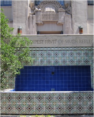 Before Goodhue took on the Library Commission, he visited the Middle East with a residential client to study water use in desert gardens. The tiered garden design and the Islamic tiled fountain on the Library’s Hope Street entrance reflect what he learned on his travels. Even though the fountain has not functioned for many years, its engraved motto, “Wisdom is the ripest fruit of much reflection.” reminds us once again of the richness on the library’s shelves.
