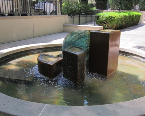 Facing the Fifth Street side, next to the Patina Restaurant, is the zen-like fountain of porcelain, cement, glass, and ceramic tile. Mineo Mizuno designed the porcelain sculptures which are the water source, and artist Laddie John Dill chose the pigments of ground oxides and minerals on the fountain floor to reflect those that existed in the earth below the fountain site eons before the library was built. The tiled floor forms an aperture, not unlike that of a camera lens, which lets in light, another nod to the library’s motto. “The Light of Learning.”