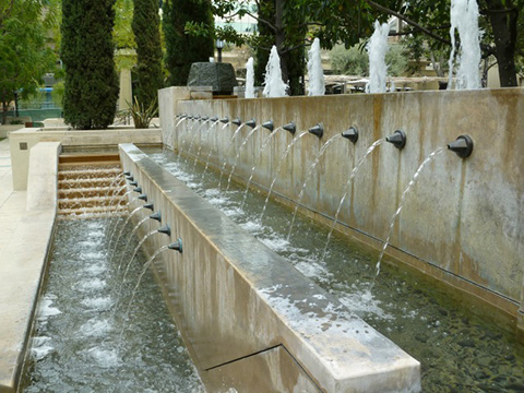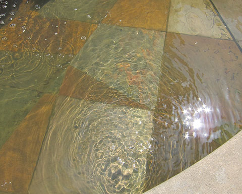 The zen-like quiet of this fountain designed by Laddie John Dill and Mineo Mizuno wears the luster of more than 20 years of fountain water spilling onto the glass, porcelain, and concrete formations that reflect the colors of the fountain floor.
