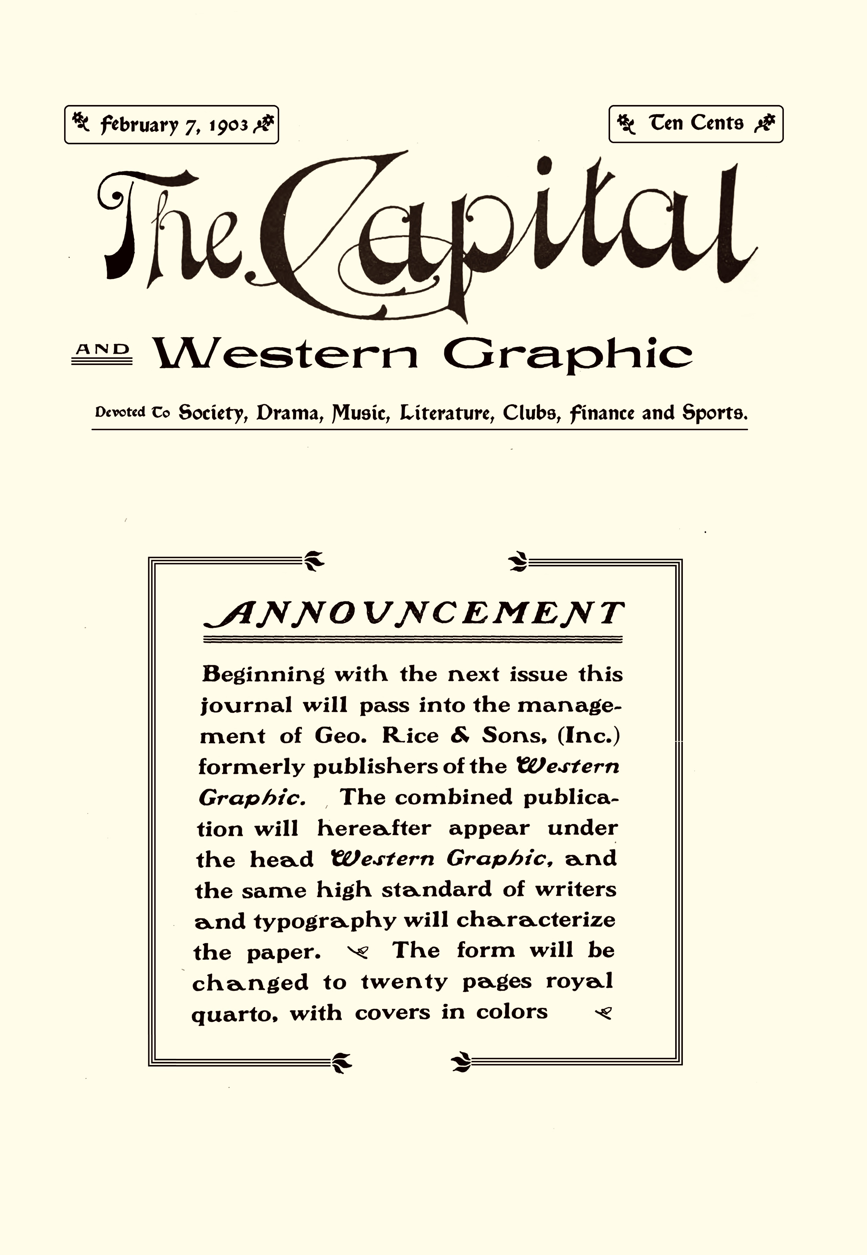 Kelsey sought to combine The Capital and the Western Graphic as "Mr. Kelsey believes that the Los Angeles field is not large enough to support two such papers." The new incarnation of the periodical, known for a time as "The Capital and Western Graphic" reverted back to the layout of The Capital and operated successfully for a time until, in a rather strange twist, the magazine was apparently sold back to George Rice in early 1903. Rice then opted to revert back to his original title, the Western Graphic and just to make things even more convoluted, he decided to sell the magazine in 1904. Out of the ashes of the Western Graphic, The Capital, and an assortment of smaller publications that had been consumed by both magazines, The Graphic was born.