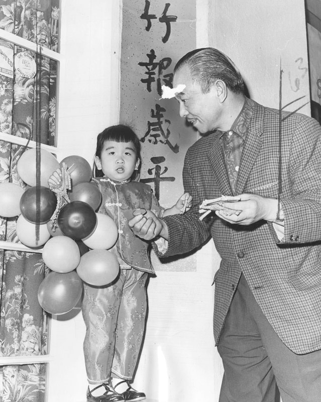 Eugene Yee and niece Susan celebrate Chinese New Year with balloons and firecrackers [1964 / Year of the Dragon]. Howard Ballew / Herald-Examiner Collection