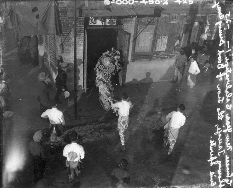 Tsweje, the Lion of Good, drives away evil spirits during this celebration of the Chinese New Year [1925 / Year of the Ox]. Security Pacific National Bank Collection