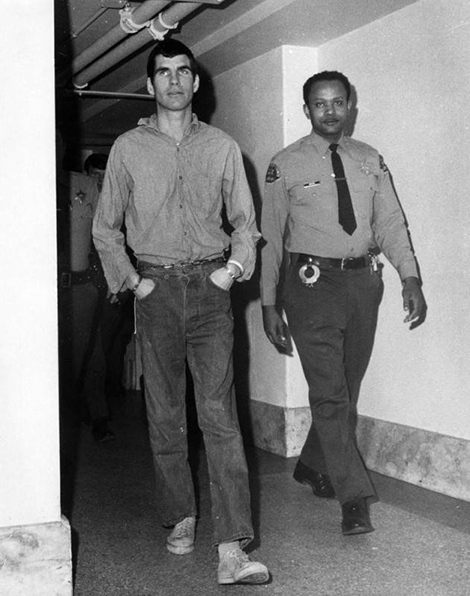 Charles 'Tex' Watson today following court appearance. Watson was accused of the murders at both the home of Sharon Tate and Leno and Rosemary La Bianca. His trial began after Manson, Krenwinkel and Van Houten were convicted and sentenced. He was also found guilty in October, 1971. Photo credit, Michael Haering, Herald Examiner Collection