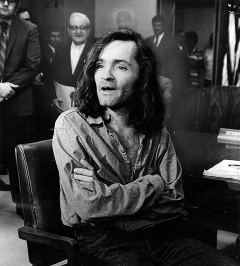 "Charles Manson in Superior Court. Later told newsmen: 'You're the jury... the court.'" Manson was in a Santa Monica courtroom to answer questions from the press after he entered a not guilty plea in the murder of Gary Hinman, [1970]. Photo credit, Michael Haering, Herald Examiner Collection