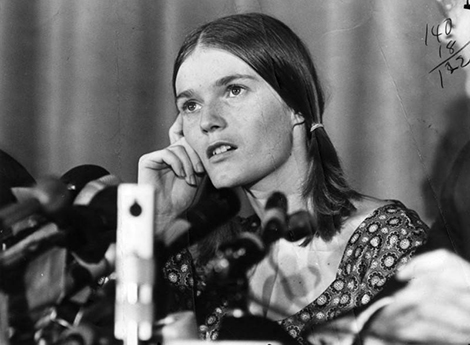 Linda Kasabian shown testifying in court against Charles Manson and his Family, of which she was formerly a member, [August 19, 1970]. Herald Examiner Collection