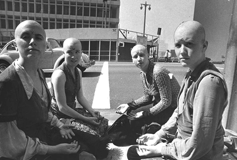 Nancy Pitman (a.k.a Brenda McCann), Sandra Good, Catherine Gillies, and Mary (Mary Theresa Brunner) dubbed "the girls on the corner." They shaved their heads along with Manson, Atkins, Krenwinkel, and Van Houten following the guilty verdicts. They told reporters, "You'd better watch your children because Judgment Day is coming!" [1971]. Herald Examiner Collection