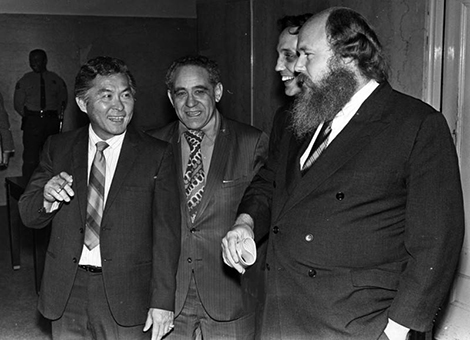 Charles Manson's defense attorneys after resting their case on November 19, 1970: from left, Daye Shinn, Irving Kanarak, Paul Fitzgerald and Ronald Hughes, [1970]. Herald Examiner Collection