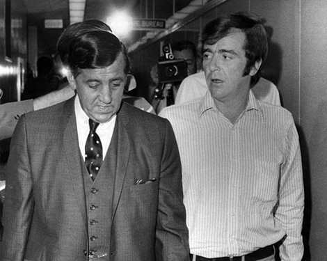 Sharon Tate murder suspect Thomas Harrigan is shown being escorted into the LAPD building by his attorney Paul Caruso, [August 19, 1969]. Herald Examiner Collection