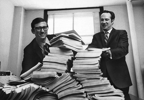 Photograph caption dated January 19, 1971 reads, "The 168 volumes of transcripts of the Tate trial, with 5,752,080 words. Deputy District Attorneys Stephen Kay (left) and Donald Musick stack manuscripts." Herald Examiner Collection