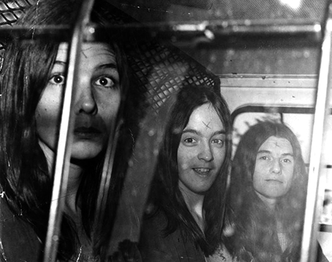 From Left: Leslie Van Houten, Susan Atkins and Patricia Krenwinkel shown in a transport van during the time of the Tate-LaBianca murder trials, [1971]. Herald Examiner Collection