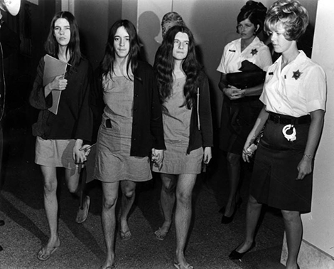 From left, Leslie Van Houten, Susan Atkins and Patricia Krenwinkel in hallway of Hall of Justice for their appearance as defendants in the Tate-LaBianca murder trial, [1970]. Herald Examiner Collection