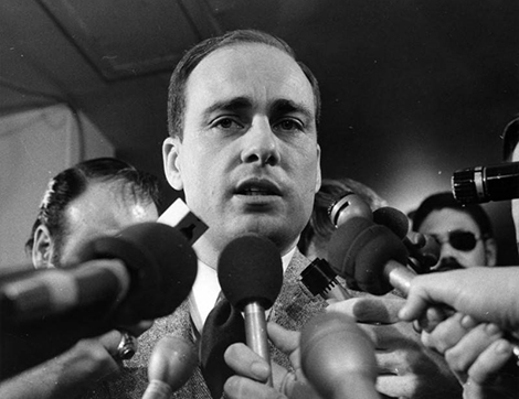 Vicent Bugliosi, attorney for the prosecution in the Tate-LaBianca trial. He is pictured here at a press conference after he won his battle for the death sentence in the trial, [1971]. Herald Examiner Collection